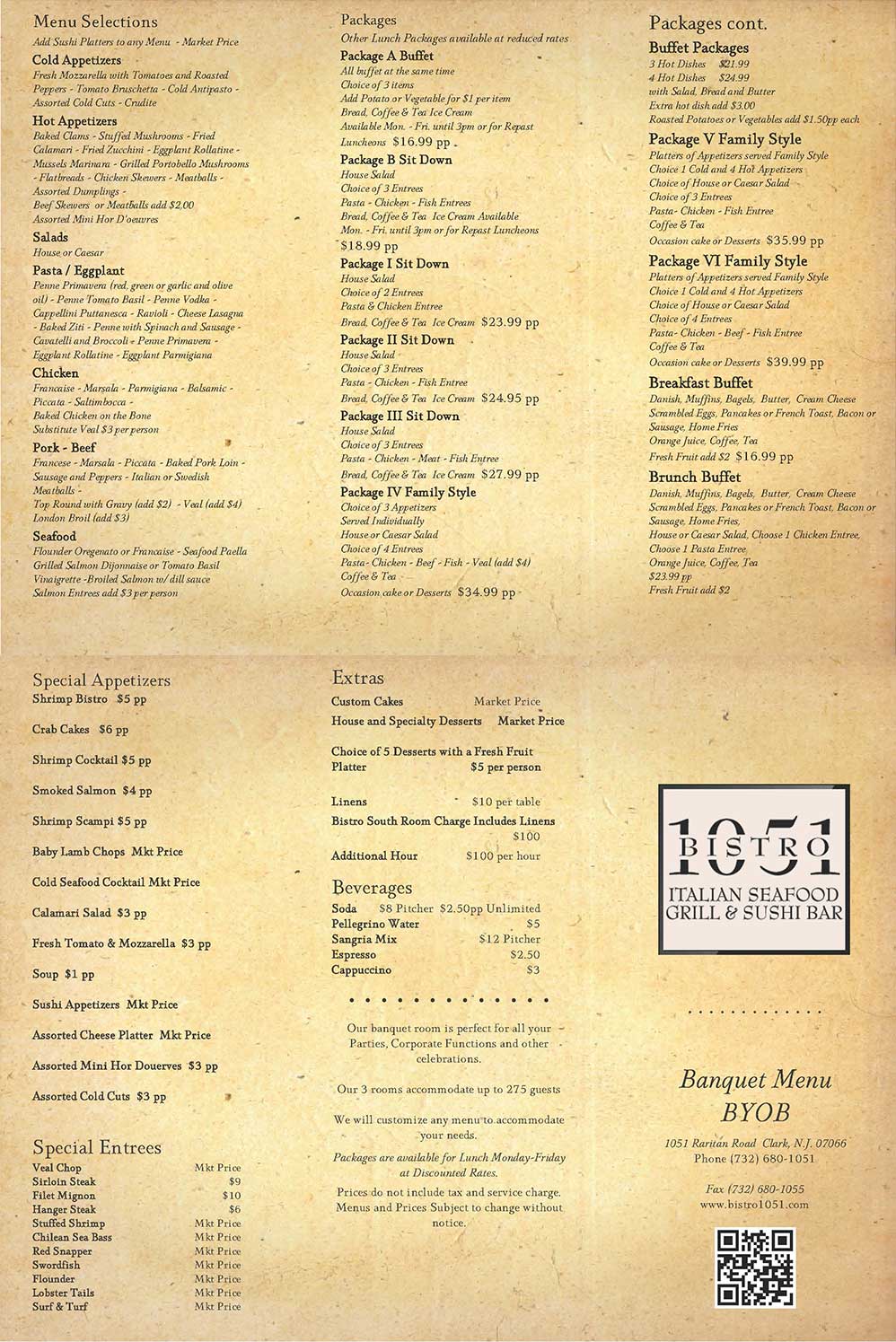 At Bistro 1051, our Clark NJ banquet halls provide a beautiful backdrop for our food to host your next party. Our banquet menu is as eclectic and diverse as our restaurants menu, allowing us to customize your menu to be exactly what you need to make your event perfect. this is just one of the reasons we have become a leader among banquet halls in Clark New Jersey. As you can see, our menu provides you with options for buffet, sit down, or family style meals. We even offer packages for buffet breakfasts and brunches! On top of all else you can make your event truly your own with special appetizers, entrees, and extras. To start planning your event at our beautiful banquet halls in Clark New Jersey, please call us for a free consultation at 732-680-1051 or email requests to BistroMike@aol.com.